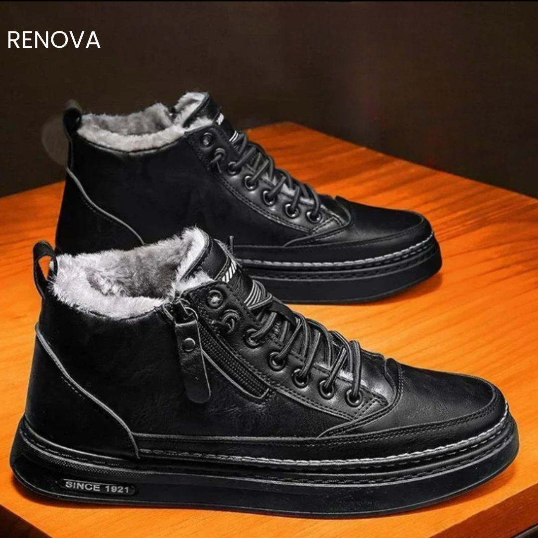Superior craftsmanship meets winterized functionality in this shearling-lined leather boot, where a plush fur collar provides exceptional warmth against the elements. The substantial platform sole with heritage branding and convenient side zipper demonstrate meticulous attention to both comfort and refined utility.